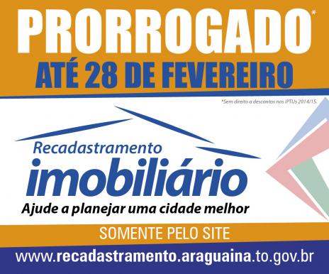 O Recadastramento Imobiliário é feito somente pelo site www.recadastramento.araguaina.to.gov.br. Para realizar o procedimento, o proprietário deverá ter em mãos CPF, endereço para correspondência, endereço do imóvel, conta de água ou conta de energia.