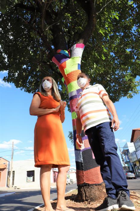 Quem passa pela Avenida Prefeito João do Sousa Lima, no Centro, logo percebe uma árvore de ipê com o tronco decorado com um imenso crochê de cores diversas