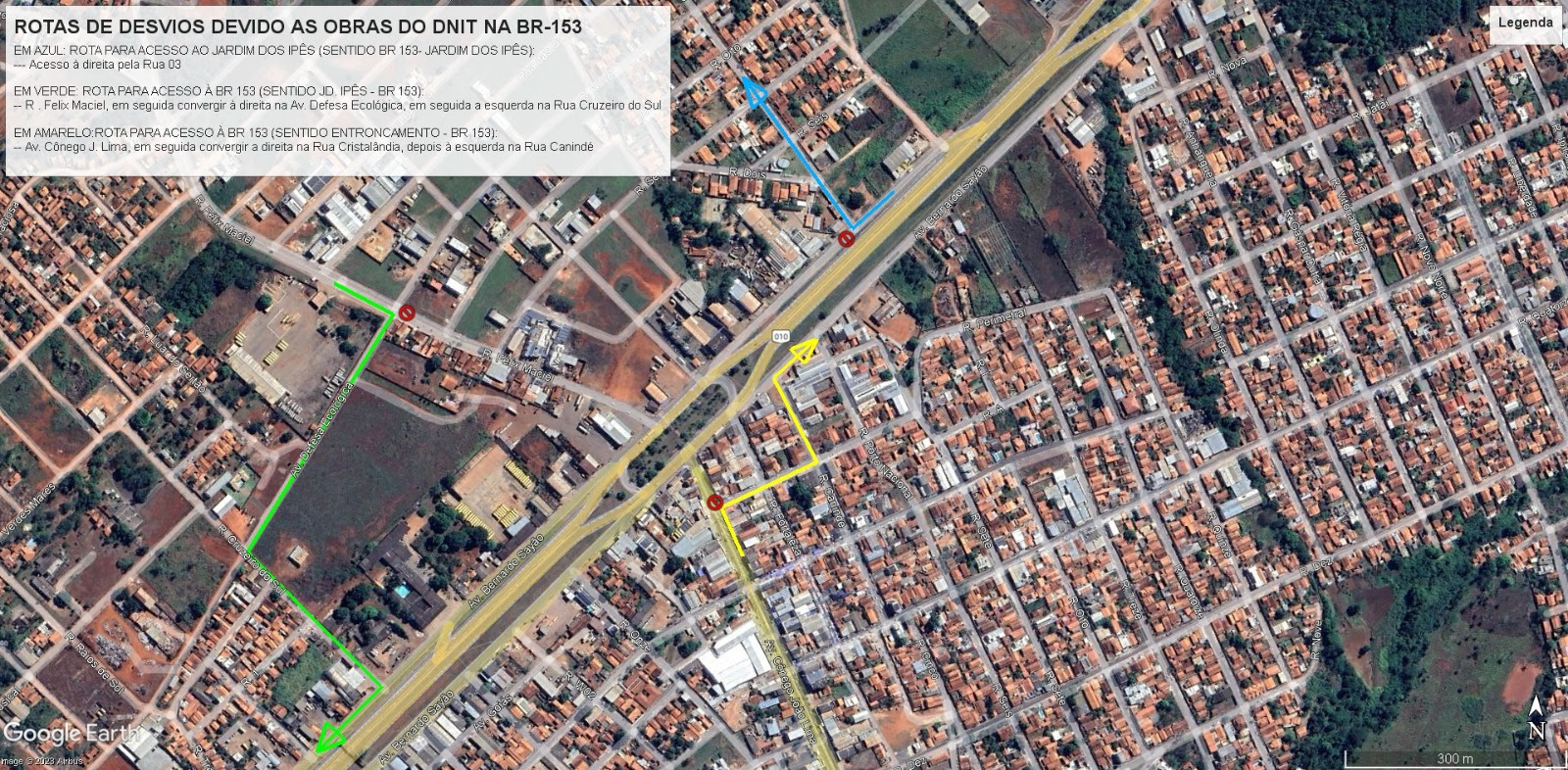 Quem está na BR-153 sentido norte-sul (de Wanderlândia para Colinas, por exemplo), deve fazer o desvio virando à direita na Rua 3, no Setor José Ferreira, depois do Centro de Distribuição dos Correios. O conduto deve seguir em frente e virar à esquerda na Rua 9, passando por dentro do Jardim Europa, cruzando a Avenida Cônego João Lima na Vila Piauí, acessando a Avenida Defesa Ecológica. Depois, é preciso virar à esquerda na Rua Cruzeiro do Sul e depois à direita na Avenida Bernardo Sayão.