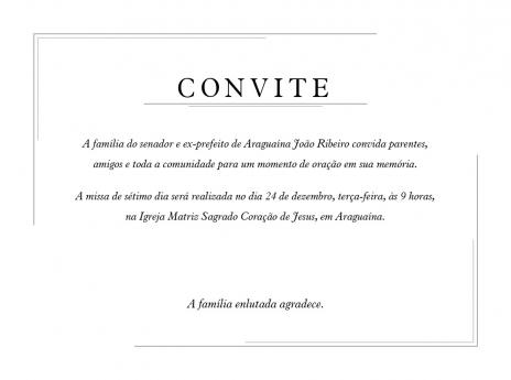 A missa de sétimo dia do falecimento do senador João Ribeiro será realizada em Araguaína nesta terça-feira, 24 de dezembro. O evento, que contará com a presença de familiares e autoridades, acontecerá às 9h, no Santuário Sagrado Coração de Jesus, na Praça São Luís Orione (Praça das Nações). O senador iniciou sua carreira política na cidade, onde é muito querido pela população.