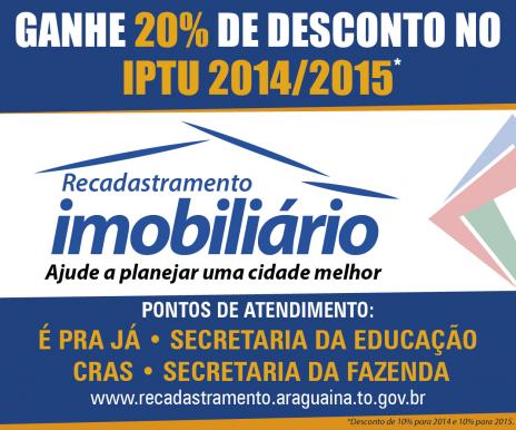 Dia 20 de janeiro é o último prazo para realização do Recadastramento Imobiliário em Araguaína. Todos os proprietários de imóveis, edificados ou não, e até mesmo aqueles isentos de IPTU, devem ser cadastrados ou ter seus dados atualizados no sistema. O recadastramento é obrigatório e concede descontos de 10% nos IPTUs de 2014 e 2015. “O processo é simples, relativamente rápido e é bom para os dois lados, poder público e sociedade”, ressalta o secretário da Fazenda, Alberto Brito.