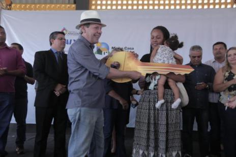 A trabalhadora rural Diana Macedo foi a primeira a receber das mãos do prefeito Ronaldo Dimas, as chaves de sua casa. Ela vive sozinha com os três filhos e pagava aluguel há mais de um ano. “Não vejo a hora de fazer logo a mudança. Estou muito feliz!”, comemorou.