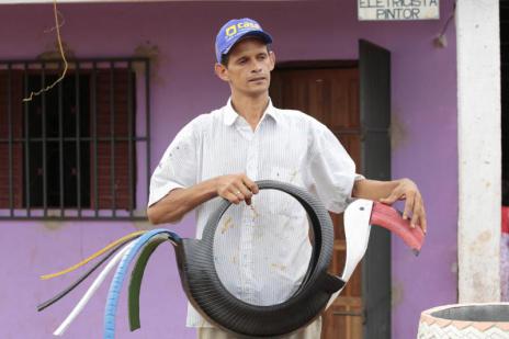 Pedreiro, serralheiro e servente em linha de transmissão da torre, Gildázio Nogueira da Silva, morador do Setor Araguaína Sul, em Araguaína, já esteve em muitas profissões. Pensando em como aumentar sua renda e ter independência financeira, resolveu seguir um sonho de criança. Há dois anos, investe parte do seu dia em transformar pneus velhos em obras de arte e retira do lixo o seu sustento. Com a sua arte, ele ainda contribui para a preservação do meio ambiente e para a saúde pública, evitando possíveis criadouros do mosquito Aedes aegypti.
