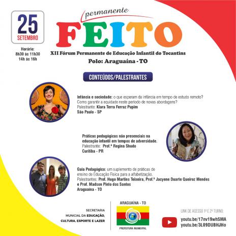 Nesta sexta-feira, 25, cerca de 2 mil profissionais da Rede Municipal de Ensino de Araguaína vão participar de mais um debate voltado à melhoria da educação infantil em tempos de pandemia. O XII Fórum Permanente de Educação Infantil do Tocantins (FEITO), Polo Araguaína, é focado no desenvolvimento de ações que melhorem a educação de crianças entre 6 meses e 5 anos de idade, ampliando também o acesso aos Centros de Educação Infantil (CEI).