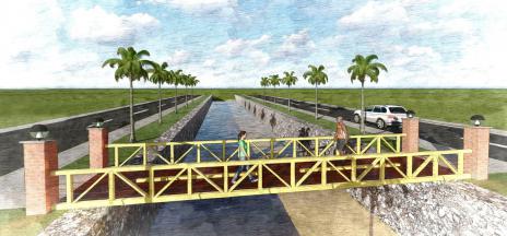O assoalho da passarela que vai sustentar os pedestres é de madeira e o guarda-corpo de 1,10 metro tem o mesmo padrão de qualidade e ornamento do que foi construído no calçadão da Via Lago.