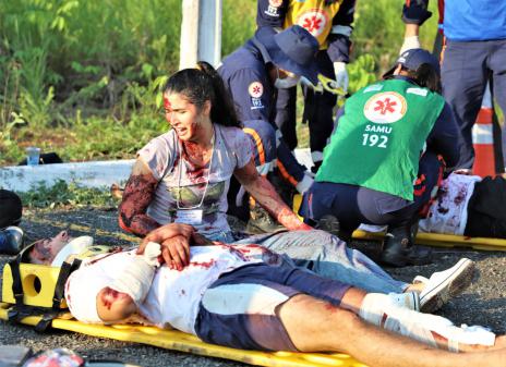 Situação real Além das aulas teóricas que abordam temas como a classificação dos acidentes, triagem das vítimas e controle de riscos, os profissionais também participaram de uma simulação de acidente de trânsito envolvendo múltiplas vítimas. Durante a simulação, os alunos do curso puderam vivenciar uma ocorrência de acidente envolvendo 20 vítimas.