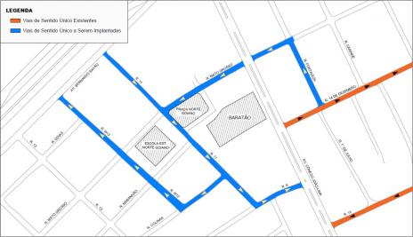 A Rua Fortaleza, entre as ruas Quatorze e Mato Grosso, será mão única sentido BR-153. Já o trecho da Rua Mato Grosso, entre as ruas Fortaleza e Onze, também terá sentido único em direção à Avenida Santos Dumont.