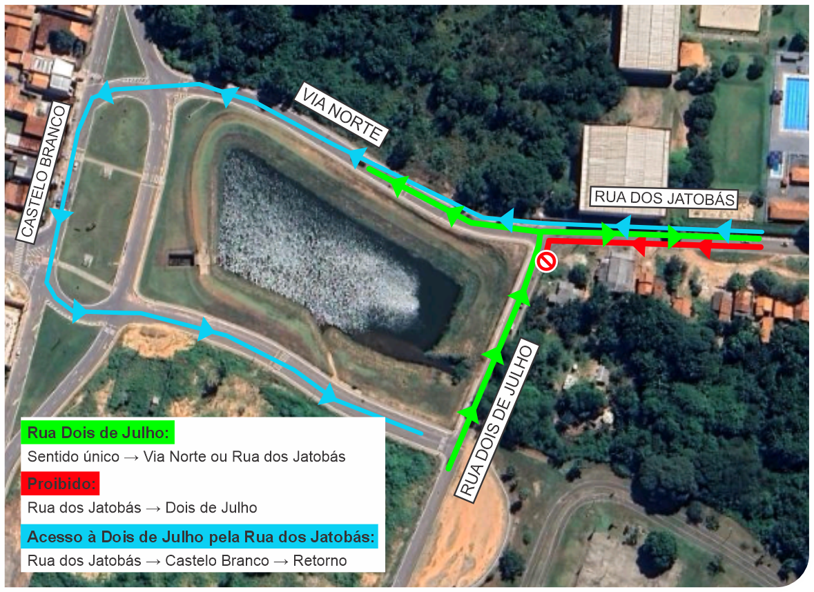 A conversão à esquerda da Rua dos Jatobás para a Rua 2 de Julho, que anteriormente era permitida, estará proibida temporariamente. Os condutores que desejarem acessar a Rua 2 de Julho deverão seguir até a Rua Castelo Branco, realizar o retorno, acessar a Via Norte, e então entrar na Rua 2 de Julho.